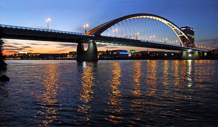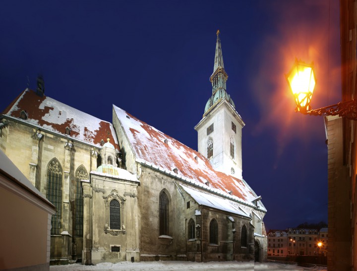 Most of Bratislava is on the north bank of the Danube. The SNP Bridge and an elevated roadway cut the Old Town in half. South banks of the river is the site of the model socialist suburb of Petržalka. The best views over the city can be seen from the Bratislava Castle, Slavin Hill with its memorial monument for the WW II Soviet liberation army soldiers, and Kamzík Peak with the Bratislava TV transmission tower and its rotating restaurant. The Old Town consists of the Castle, the St. Michael’s Gate, St. Martin’s Cathedral and Academia Istropolitana – the first university in the Hungarian monarchy founded by Matthias Corvinus, the Primate Palace, the Old Town Hall, the Slovak National Opera and Ballet.