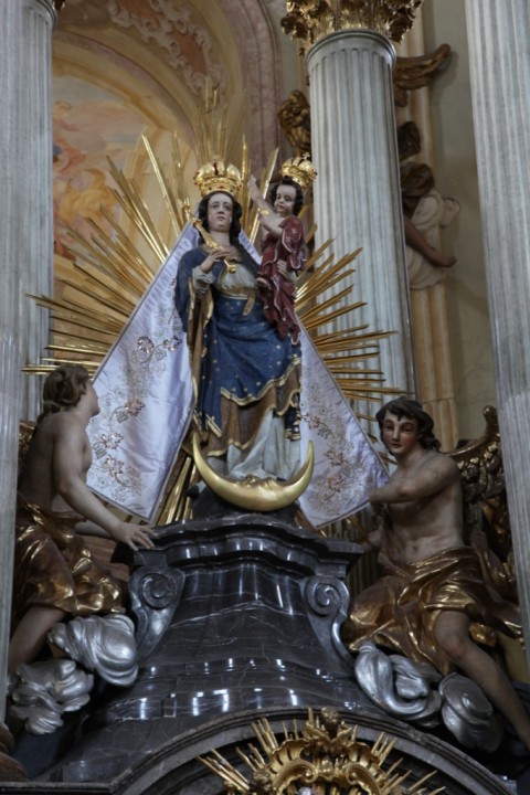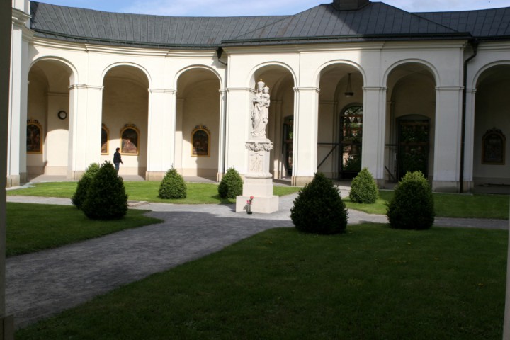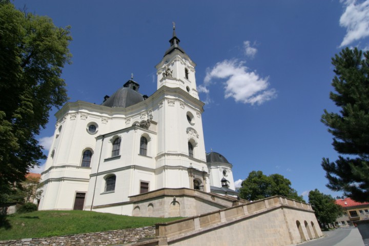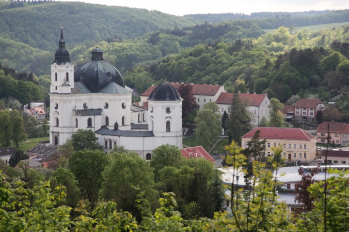 Křtiny is a market town located northeast of Brno in the picturesque Moravian Karst. It is an old Marian pilgrimage site. It is sometimes called the Pearl of Moravia. The Baroque pilgrim complex consists of the Church of the Holy Name of Mary, which houses the Gothic statue of the Virgin Mary of Křtiny, St Anne’s Chapel, the Provost’s Residence and other buildings. The church is the work of Giovanni Santini, one of the most important architects of the European Baroque style, who built dozens of important buildings in Bohemia and Moravia. It is the architect’s largest building constructed on the ground plan of a Greek cross. A huge ossuary is located in the crypt below the church, where an unusual collection twelve skulls painted with laurel wreaths and the letter T was found.