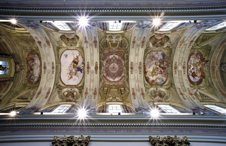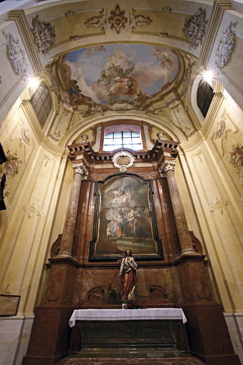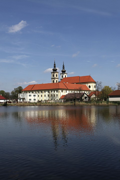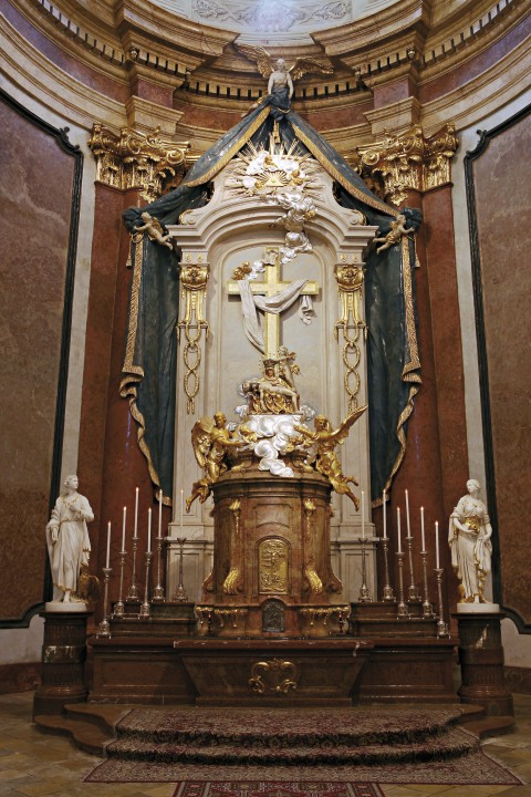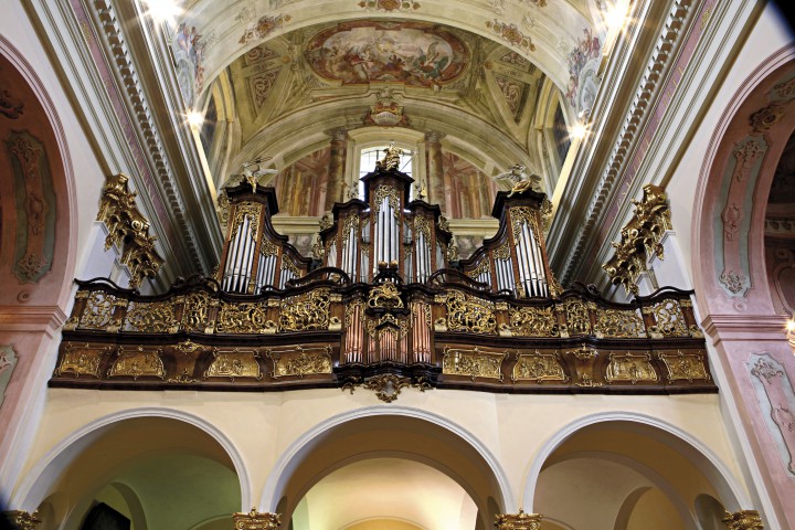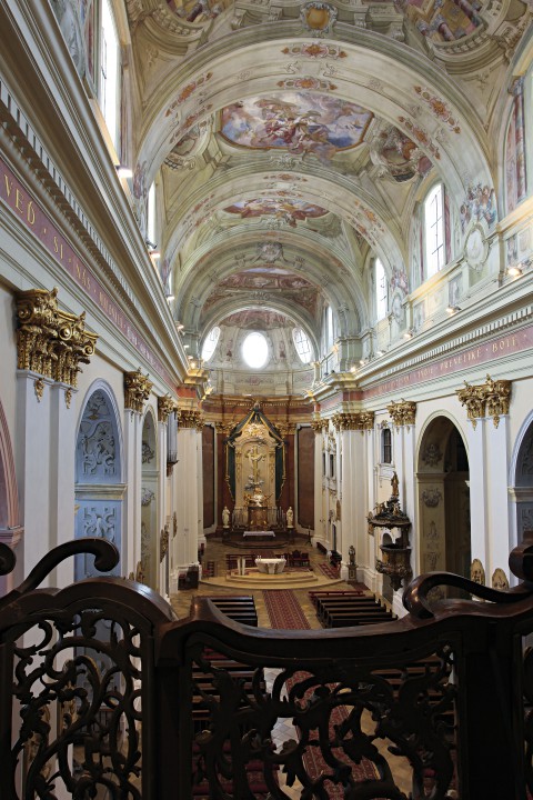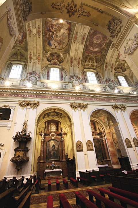 The church is 62 m long, 26 m high and 23 m wide and has six side altars with paintings by Johann Lucas Kracker. The main nave is 13 m wide and this part was painted and decorated by a painter of Lorraine origin coming from imperial court - Ján Jozef Chamant. The frescos here are his only work preserved to our days. The main altar, the original organ cabinets, the confession booths and the pews in the basilica are all the masterpiece of one the most famous Viennese architects working at that time in the kingdom of Hungary - Franz Anton Hillebrand. The south side of the church is linked to the monastery by an arcade corridor. The monastery building has three wings, which make a square with the basilica as the fourth side.